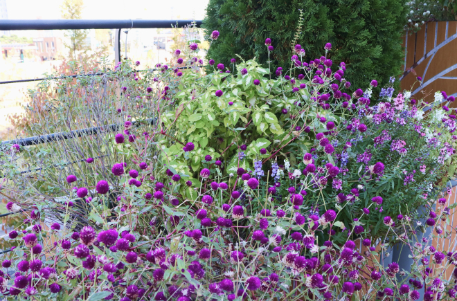 Evergreen trees that balance the garden include low, rounded juniper and tall, upright Skyrocket juniper, creating a sense of rhythm. Silvery-blue Angel juniper is harmoniously placed between them to create a deep blue-green backdrop.