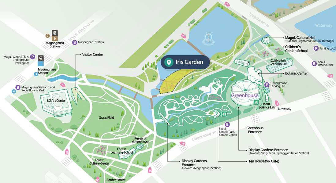 Blooming early in the morning in various colors, irises gracefully swaying their slender leaves are beautiful from any angle.